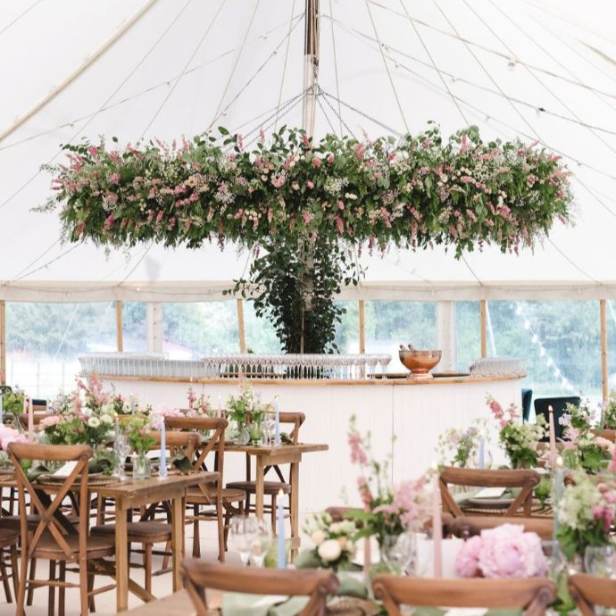 Our flower rings are hung around the king poles inside our marquees, and they create a beautiful focal point which can be dressed in any way you wish. From stunning flower and foliage arrangements to supporting multiple shiny disco balls to kick start the party, they really are a blank canvas for you to personalise!