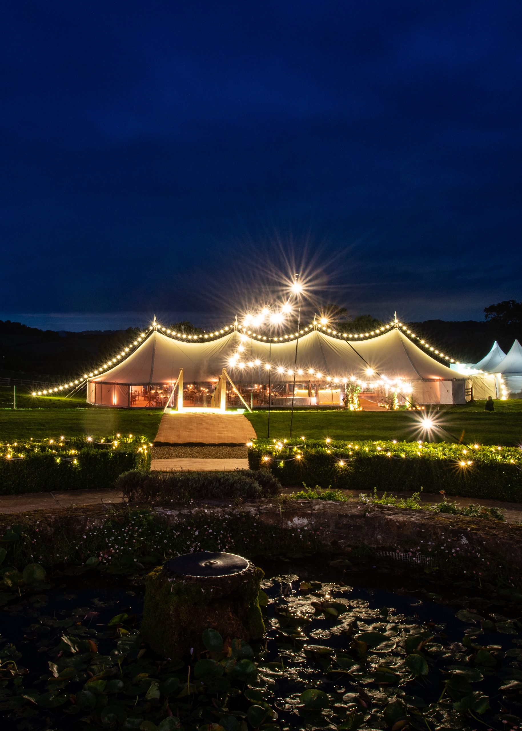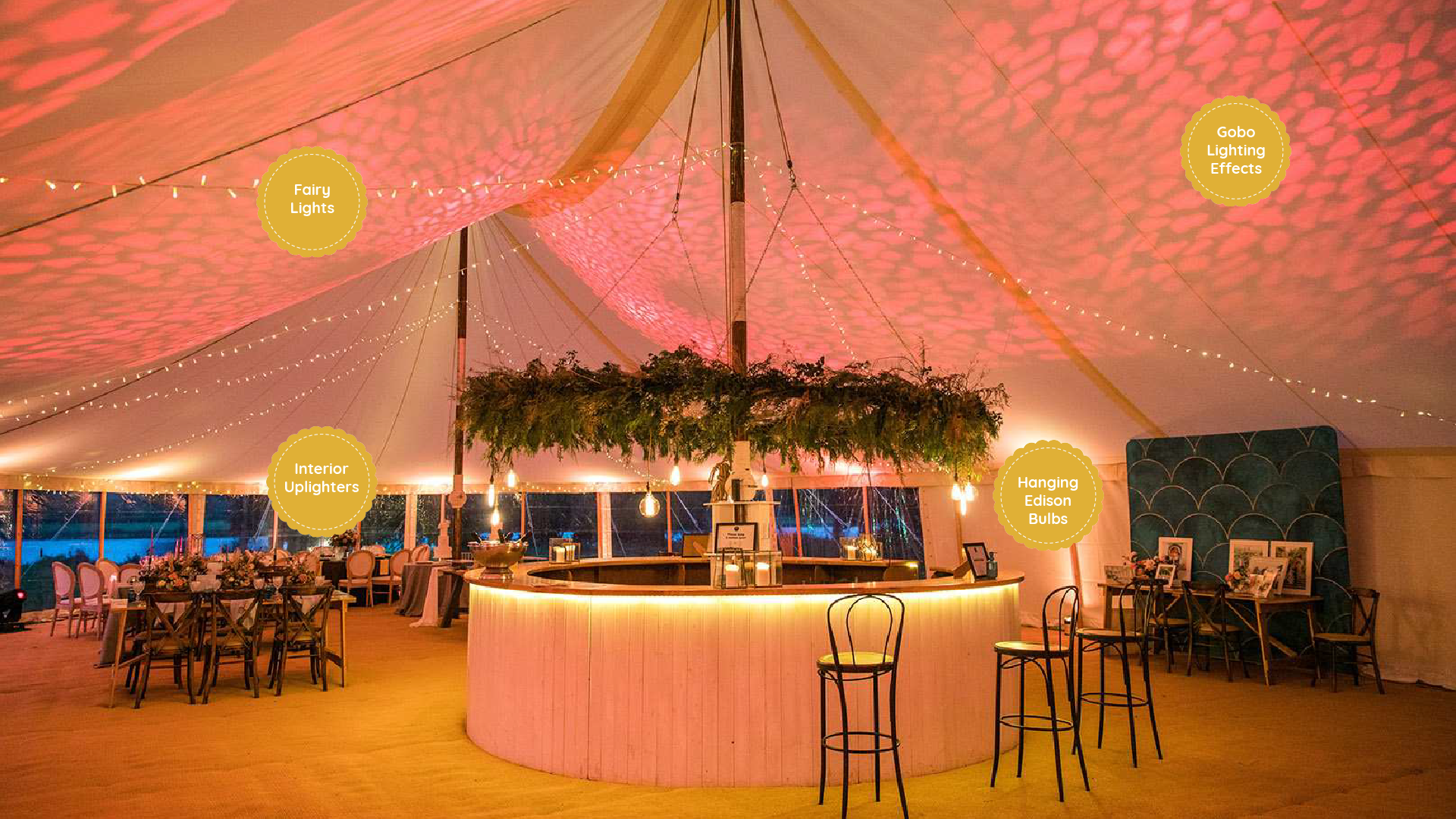When the sun goes down, own the night with our selection of atmospheric lighting.From our flying festoons that elegantly swoop across the peaks of your canvas to our gobo and internal up-lighters for added colour and pattern.
